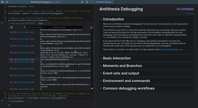 From this notebook you’ll have access to a live reproduction of the bug you’re investigating. You can run commands on your system, undo those commands, rewind and fast-forward time, and branch the multiverse to your heart’s content.