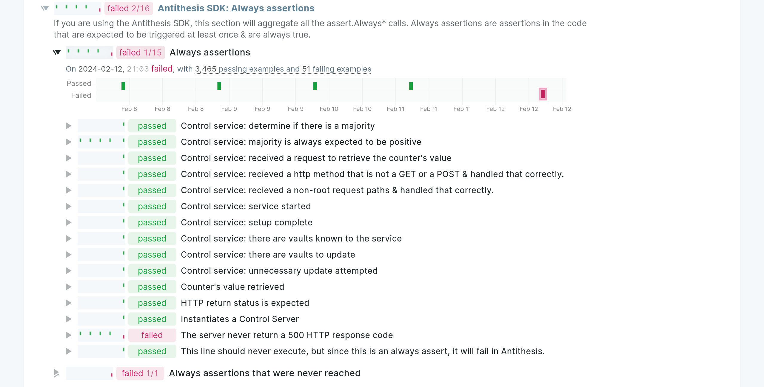 All Antithesis assertions require a message parameter, which appears in the triage report as the name of a property — so each of the “Control service” properties in the example below is a message in an assertion.