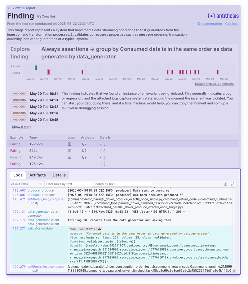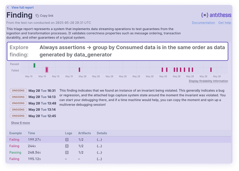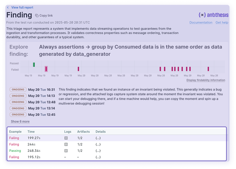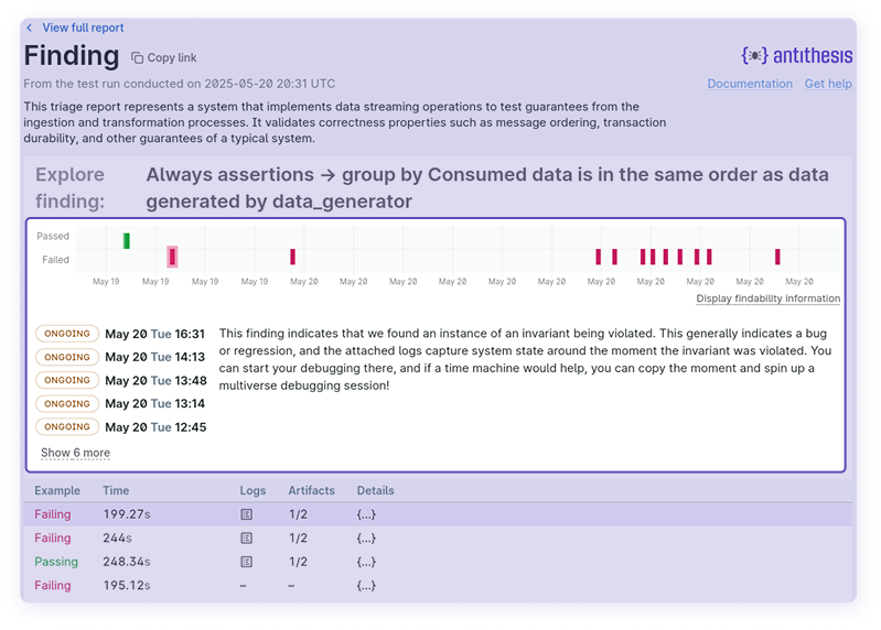 - Below the history is a selection of examples where the property was violated, drawn from the most recent test run. Every Antithesis run tests many thousands of execution paths, with your software subjected to different faults and environmental conditions each time. Usually, there are many examples for a single Finding, because Antithesis found multiple scenarios in which the property failed.