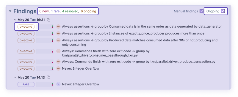 - In the unhappy circumstance that we see the issue again, Antithesis will recognize that it encountered the same regression, so the new report won’t highlight this as a “New” Finding – since it just found the behavior on the previous run! Instead, the Finding will be labeled “Ongoing.” “Ongoing” findings are hidden from view by default but can be toggled to display.