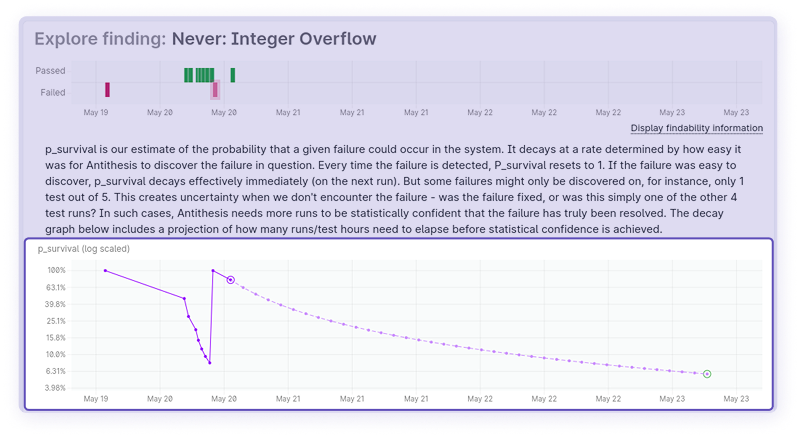 Antithesis will mark a finding as “Rare,” if we estimate the probability of encountering this behavior during a test run of your usual duration is under a certain threshold, by default 33%. Each time we encounter an occurrence of “Rare” behavior, we’ll flag it in the Findings section. You can explore each occurrence via the logs or restore them in Multiverse Debugging. When a Finding is “Rare,” we may require many test runs to determine the behavior has stopped. The Findings detail view shows our current estimate of how many runs we’ll need (behind the “Show findability information” toggle).